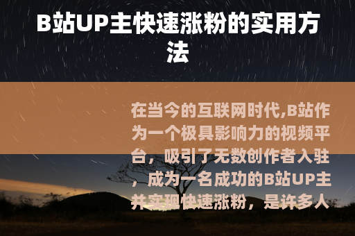 在当今的互联网时代,B站作为一个极具影响力的视频平台,吸引了无数创作者入驻,成为一名成功的B站UP主并实现快速涨粉,是许多人的梦想,B站UP主怎么涨粉快呢?以下是一些实用的方法。 质量是关键,要制作出高质量、有吸引力的视频内容,这意味着在选题上要下功夫,选择那些热门且有话题性的主题,能够引起观众的兴趣和共鸣,可以关注当下流行的文化趋势、热门的影视动漫、游戏攻略等领域,确保你的视频能在众多内容中脱颖而出,在视频制作过程中,要注重画面质量,保证画面清晰、稳定,剪辑流畅自然,添加合适的音乐和字幕,提升观众的观看体验。