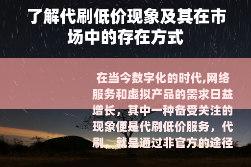 在当今数字化的时代,网络服务和虚拟产品的需求日益增长,其中一种备受关注的现象便是代刷低价服务,代刷,就是通过非官方的途径,以较低的价格为用户提供诸如粉丝数量增长、点赞量提升、视频播放量增加等各类数据操作服务。