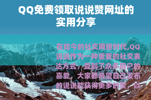 在如今的社交网络时代,QQ说说作为一种重要的社交表达方式,受到了众多用户的喜爱,大家都希望自己发布的说说能获得更多的赞,以此来增加自己在社交圈中的人气和影响力,而现在,有许多QQ免费领取说说赞的网址出现,为广大用户提供了一个便捷的途径。