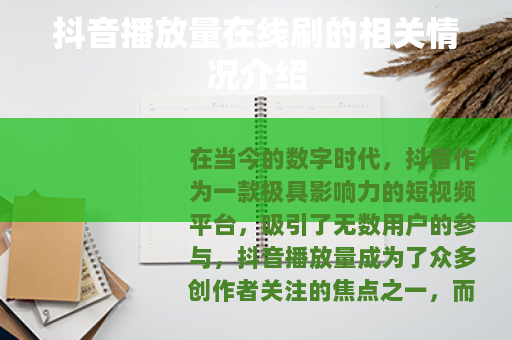 在当今的数字时代,抖音作为一款极具影响力的短视频平台,吸引了无数用户的参与,抖音播放量成为了众多创作者关注的焦点之一,而抖音播放量在线刷的现象也随之出现,引起了不少人的兴趣。