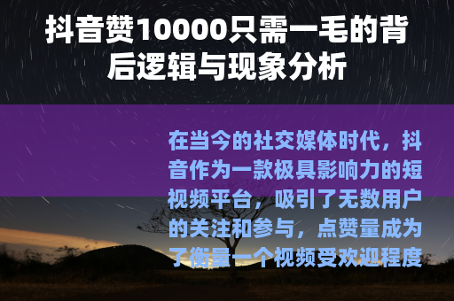 在当今的社交媒体时代,抖音作为一款极具影响力的短视频平台,吸引了无数用户的关注和参与,点赞量成为了衡量一个视频受欢迎程度的重要指标之一,而最近,市场上出现了一种声称“抖音赞10000只需一毛”的现象,引发了众多抖音用户的兴趣和讨论。