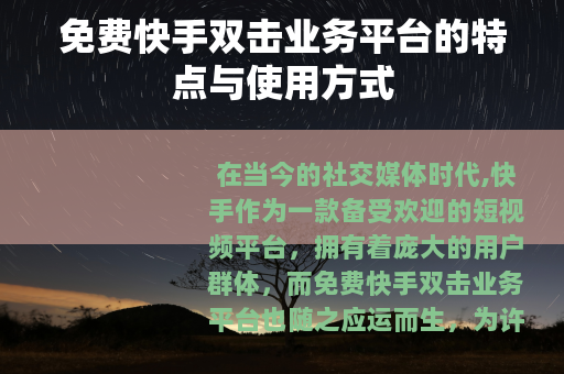 在当今的社交媒体时代,快手作为一款备受欢迎的短视频平台,拥有着庞大的用户群体,而免费快手双击业务平台也随之应运而生,为许多快手用户提供了一种独特的服务体验。