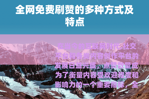 在当今的互联网时代,社交平台和各类内容创作平台的发展日益兴盛,点赞数量成为了衡量内容受欢迎程度和影响力的一个重要指标,全网免费刷赞的现象也随之出现,并且呈现出多种不同的方式和特点。