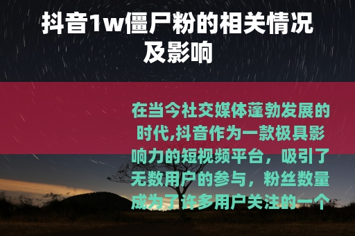 在当今社交媒体蓬勃发展的时代,抖音作为一款极具影响力的短视频平台,吸引了无数用户的参与,粉丝数量成为了许多用户关注的一个重要指标,而抖音1w僵尸粉这个现象,也逐渐引起了人们的注意。