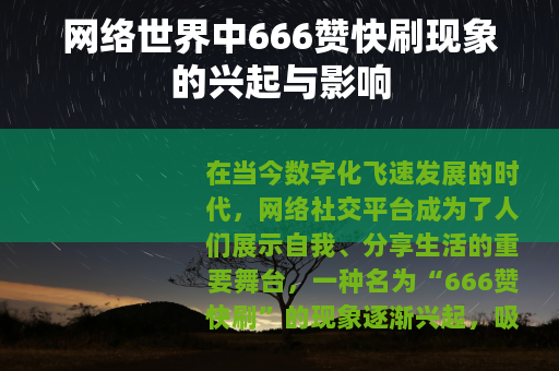 “666赞快刷”现象在网络社交平台上的兴起,既有其积极的一面,也带来了一系列的问题,我们应该客观、全面地看待这一现象,在充分发挥其积极作用的同时,采取有效措施应对其带来的负面影响,让网络社交平台能够更好地服务于用户,促进网络文化的健康发展,我们才能在数字化的时代中,真正享受到网络社交带来的便利和乐趣,让网络成为我们展示自我、交流思想、传播文化的美好家园。