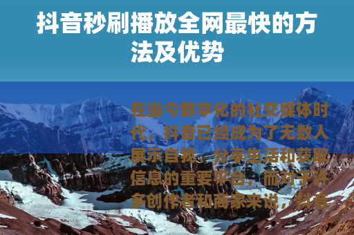 在当今数字化的社交媒体时代,抖音已经成为了无数人展示自我、分享生活和获取信息的重要平台,而对于许多创作者和商家来说,抖音视频的播放量是衡量其内容受欢迎程度和影响力的关键指标之一,在众多追求高播放量的方法中,有一种方式备受关注,那就是抖音秒刷播放全网最快的技术或服务。