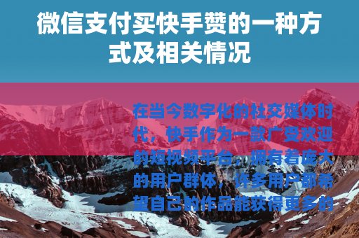 在当今数字化的社交媒体时代,快手作为一款广受欢迎的短视频平台,拥有着庞大的用户群体,许多用户都希望自己的作品能获得更多的点赞,以增加曝光度和人气,而微信支付买快手赞也成为了一种在特定圈子里被讨论的现象。