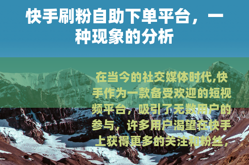 在当今的社交媒体时代,快手作为一款备受欢迎的短视频平台,吸引了无数用户的参与,许多用户渴望在快手上获得更多的关注和粉丝,以展示自己的才华、分享生活点滴或推广自己的产品和服务,在这种需求的推动下,快手刷粉自助下单平台应运而生。