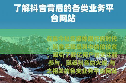 在当今社交媒体盛行的时代,抖音无疑是其中的佼佼者,吸引了数亿用户的关注和参与,随着抖音的火爆,与之相关的各类业务平台网站也如雨后春笋般涌现。