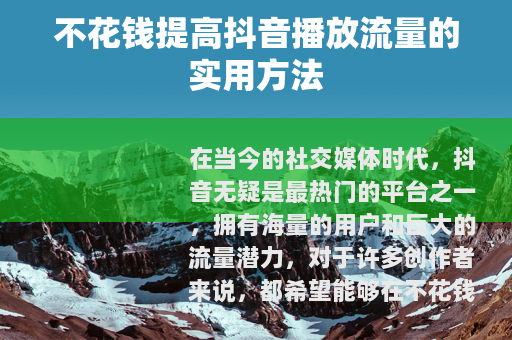 通过以上这些方法的综合运用,在不花钱的情况下,也能够有效地提高抖音视频的播放流量,让你的创作在抖音平台上获得更多的关注和认可,只要坚持不懈地努力和创新,相信你一定能够在抖音上取得不错的成绩。