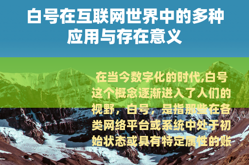 在当今数字化的时代,白号这个概念逐渐进入了人们的视野,白号,是指那些在各类网络平台或系统中处于初始状态或具有特定属性的账号,它在互联网的生态中扮演着独特的角色,有着广泛的应用和重要的价值。