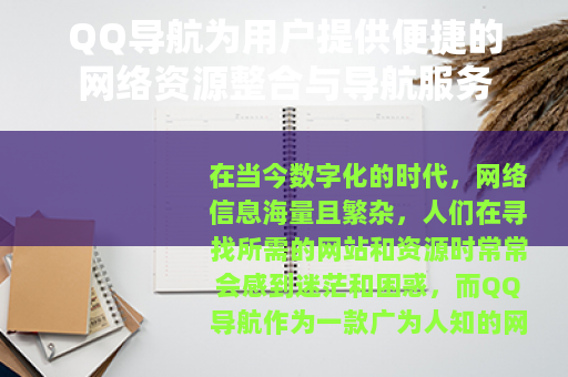 QQ导航以其丰富的资源整合、便捷的操作体验和个性化的服务,成为了广大用户在网络世界中不可或缺的好帮手,它为用户提供了一个高效、便捷的网络资源整合与导航服务,帮助用户在浩瀚的网络海洋中快速找到自己所需的信息和资源,让用户的网络生活变得更加轻松、丰富和精彩,无论是在工作、学习还是生活娱乐中,QQ导航都能为用户带来极大的便利,成为用户畅游网络世界的得力助手,随着科技的不断发展和网络的日益普及,相信QQ导航也会不断完善和创新,为用户带来更多的惊喜和价值,继续在网络导航领域发挥其重要的作用,为用户的网络生活增添更多的色彩和乐趣。