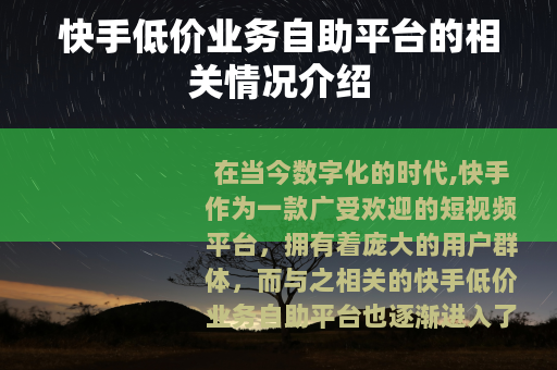 在当今数字化的时代,快手作为一款广受欢迎的短视频平台,拥有着庞大的用户群体,而与之相关的快手低价业务自助平台也逐渐进入了人们的视野。