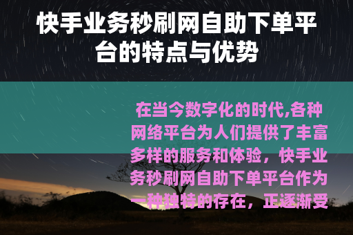 在当今数字化的时代,各种网络平台为人们提供了丰富多样的服务和体验,快手业务秒刷网自助下单平台作为一种独特的存在,正逐渐受到越来越多用户的关注。