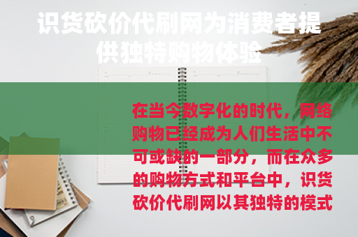 在当今数字化的时代,网络购物已经成为人们生活中不可或缺的一部分,而在众多的购物方式和平台中,识货砍价代刷网以其独特的模式和优势,逐渐受到了越来越多消费者的关注和喜爱。
