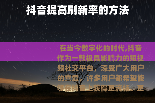 在当今数字化的时代,抖音作为一款极具影响力的短视频社交平台,深受广大用户的喜爱,许多用户都希望能够在抖音上获得更流畅、更优质的观看体验,而提高刷新率就是其中一个关键因素,抖音怎么可以提高刷新率呢?