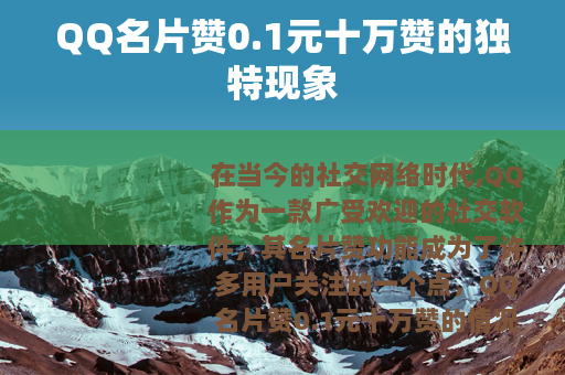 在当今的社交网络时代,QQ作为一款广受欢迎的社交软件,其名片赞功能成为了许多用户关注的一个点,QQ名片赞0.1元十万赞的情况逐渐引起了人们的注意。