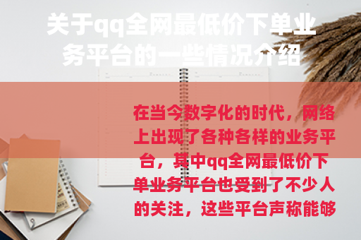 在当今数字化的时代,网络上出现了各种各样的业务平台,其中qq全网最低价下单业务平台也受到了不少人的关注,这些平台声称能够以较低的价格提供与qq相关的各种业务服务,吸引了众多用户的目光。