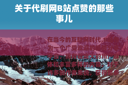 在当今的互联网时代,B站作为一个广受欢迎的视频分享平台,拥有着庞大的用户群体和丰富多样的内容,对于许多创作者来说,获得更多的点赞是他们追求的目标之一,这不仅能增加视频的曝光度,还能带来更多的关注和粉丝,而在这个需求的背后,代刷网B站点赞的现象也悄然兴起。