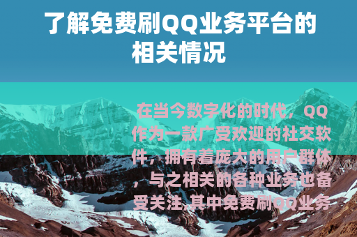 在当今数字化的时代,QQ作为一款广受欢迎的社交软件,拥有着庞大的用户群体,与之相关的各种业务也备受关注,其中免费刷QQ业务平台在网络上引起了不少人的兴趣。