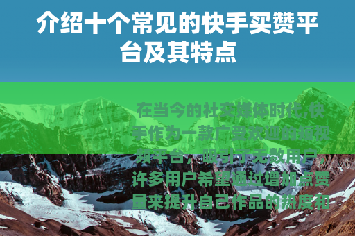 在当今的社交媒体时代,快手作为一款广受欢迎的短视频平台,吸引了无数用户,许多用户希望通过增加点赞量来提升自己作品的热度和影响力,从而催生了众多快手买赞平台,以下将为大家介绍十个这样的平台及其各自的特点。