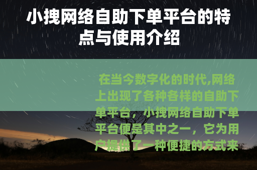 在当今数字化的时代,网络上出现了各种各样的自助下单平台,小拽网络自助下单平台便是其中之一,它为用户提供了一种便捷的方式来满足自身的多种需求。