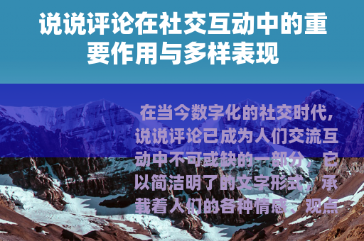 说说评论在我们的社交生活中扮演着至关重要的角色,它是我们与朋友、家人、同事以及陌生人交流的窗口,通过这个窗口,我们可以传递情感、分享观点、获取知识、寻求支持,它让我们的社交圈子不再局限于现实生活中的面对面交流,而是拓展到了更广阔的虚拟空间,让我们能够与世界各地的人建立联系,共同构建一个丰富多彩的社交世界,无论是在个人的成长过程中,还是在社会文化的发展中,说说评论都有着不可替代的作用,值得我们去重视和探索,我们要善于运用这一工具,让它为我们的生活增添更多的美好和意义,让我们在社交的海洋中畅游,享受交流带来的快乐和收获。