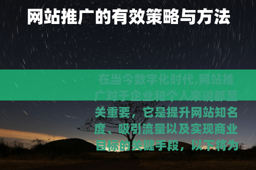 在当今数字化时代,网站推广对于企业和个人来说都至关重要,它是提升网站知名度、吸引流量以及实现商业目标的关键手段,以下将为您详细介绍一些行之有效的网站推广策略与方法。