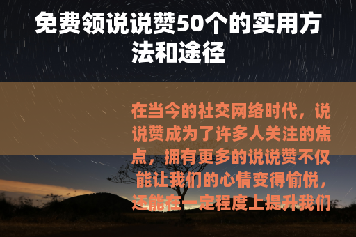 在当今的社交网络时代,说说赞成为了许多人关注的焦点,拥有更多的说说赞不仅能让我们的心情变得愉悦,还能在一定程度上提升我们在社交平台上的影响力,而现在,有一个好消息要告诉大家,那就是可以免费领说说赞50个。