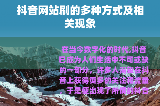 在当今数字化的时代,抖音已成为人们生活中不可或缺的一部分,许多人渴望在抖音上获得更多的关注和流量,于是便出现了所谓的抖音网站刷的现象。