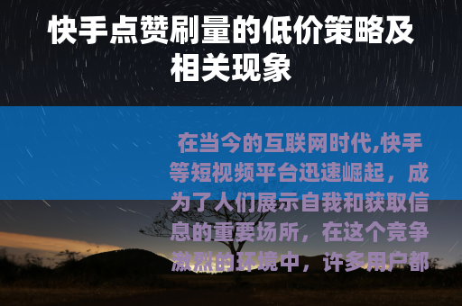在当今的互联网时代,快手等短视频平台迅速崛起,成为了人们展示自我和获取信息的重要场所,在这个竞争激烈的环境中,许多用户都希望自己的作品能够获得更多的点赞,以提高曝光度和影响力,而低价刷快手点赞的现象也随之出现。