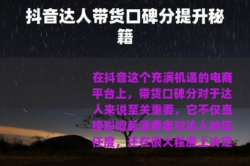 在抖音这个充满机遇的电商平台上,带货口碑分对于达人来说至关重要,它不仅直接影响着消费者对达人的信任度,还在很大程度上决定了达人在平台上的发展前景,抖音达人带货口碑分究竟如何提高呢?以下是一些实用的方法和技巧。