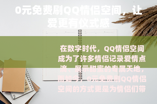 在数字时代,QQ情侣空间成为了许多情侣记录爱情点滴、展示甜蜜的专属天地,而如今,0元免费刷QQ情侣空间的方式更是为情侣们带来了全新的体验,让这份浪漫无需花费一分钱就能更加绚丽多彩。