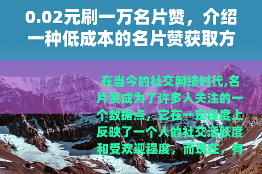 在当今的社交网络时代,名片赞成为了许多人关注的一个数据点,它在一定程度上反映了一个人的社交活跃度和受欢迎程度,而现在,有一种现象引起了不少人的注意,那就是以0.02元刷一万名片赞的服务,号称全网最低。