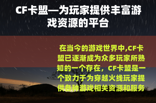 在当今的游戏世界中,CF卡盟已逐渐成为众多玩家所熟知的一个存在,CF卡盟是一个致力于为穿越火线玩家提供各种游戏相关资源和服务的平台。