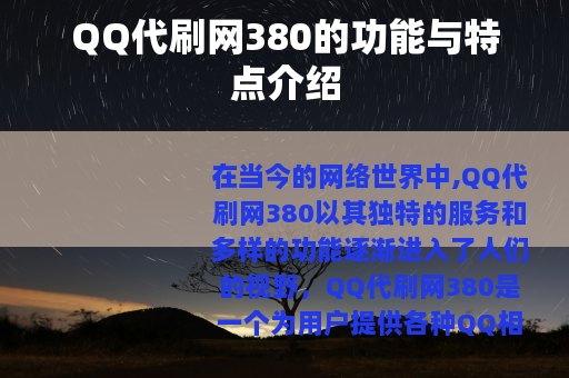 在当今的网络世界中,QQ代刷网380以其独特的服务和多样的功能逐渐进入了人们的视野,QQ代刷网380是一个为用户提供各种QQ相关业务代刷服务的平台。