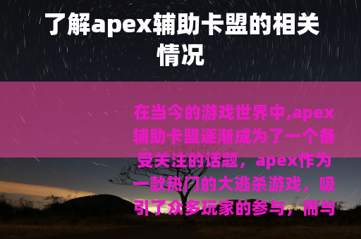 在当今的游戏世界中,apex辅助卡盟逐渐成为了一个备受关注的话题,apex作为一款热门的大逃杀游戏,吸引了众多玩家的参与,而与之相关的辅助卡盟也应运而生。
