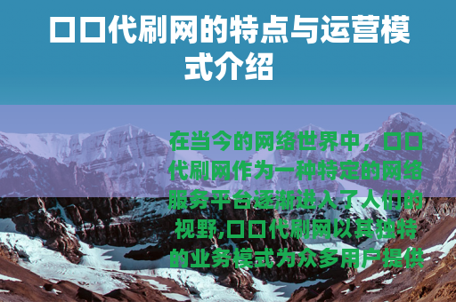 在当今的网络世界中,口口代刷网作为一种特定的网络服务平台逐渐进入了人们的视野,口口代刷网以其独特的业务模式为众多用户提供了一系列的服务。