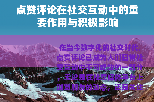 在当今数字化的社交时代,点赞评论已成为人们日常社交互动中不可或缺的一部分,无论是在社交媒体平台上浏览朋友的动态,还是关注各类公众账号的信息发布,点赞评论都以其独特的方式丰富着我们的社交体验,构建着人与人之间的联系,展现出诸多重要作用和积极影响。