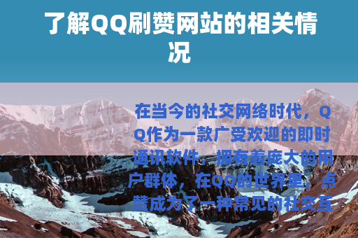 在社交网络日益普及的今天,QQ刷赞网站作为其中的一个组成部分,将继续在社交领域发挥着一定的作用,我们要正确认识它的存在价值和意义,合理利用其资源和优势,同时也要关注其发展动态和趋势,以便更好地适应社交网络的变化,在社交世界中实现自己的目标和价值,无论是普通用户还是从事相关行业的人士,都应该在使用刷赞网站的过程中,保持理性和谨慎,以积极健康的心态去面对社交网络中的各种现象和挑战,共同营造一个良好的社交生态环境。 能满足您的需求,您可以根据实际情况进行调整和修改,需要注意的是,刷赞等行为可能违反相关平台规定和法律法规,实际生活中不建议进行此类操作。