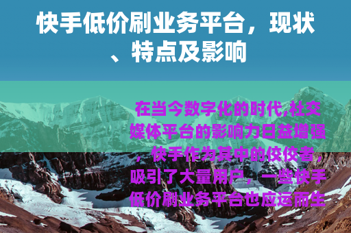 快手低价刷业务平台是一个在社交媒体发展过程中出现的特殊现象,它既满足了部分用户快速提升账号数据的需求,又带来了一系列的问题和挑战,只有通过平台、用户以及社会各方的共同努力,才能更好地规范这一市场,让社交媒体平台能够健康、有序地发展。