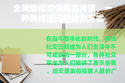 在当今数字化的时代,网络社交已经成为人们生活中不可或缺的一部分,各种社交平台为人们提供了展示自我、结交朋友和拓展人脉的广阔空间,而名片赞作为社交平台上一种常见的互动方式,也逐渐受到了众多用户的关注,全网最低价快刷名片赞的服务便应运而生,为许多希望在社交平台上获得更多关注和认可的用户提供了一种看似便捷的途径。