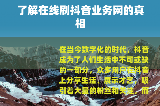 在当今数字化的时代,抖音成为了人们生活中不可或缺的一部分,众多用户在抖音上分享生活、展示才艺,吸引着大量的粉丝和关注,而随着抖音的火爆,一些所谓的在线刷抖音业务网也应运而生。