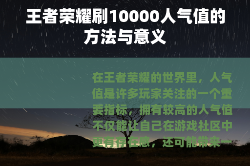 在王者荣耀的世界里,人气值是许多玩家关注的一个重要指标,拥有较高的人气值不仅能让自己在游戏社区中更有存在感,还可能带来一些额外的福利和机会,而刷10000人气值也成为了不少玩家努力的目标。