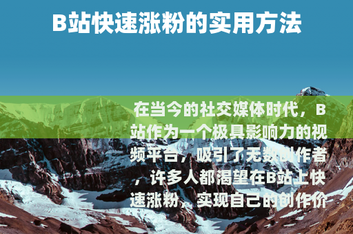 在当今的社交媒体时代,B站作为一个极具影响力的视频平台,吸引了无数创作者,许多人都渴望在B站上快速涨粉,实现自己的创作价值和影响力,以下是一些在B站更快涨粉的有效方法。 质量是关键,要制作出高质量、有吸引力的视频内容,这意味着在选题上要独具匠心,找到那些能够引起观众兴趣和共鸣的话题,热门的游戏攻略、有趣的生活趣事分享、专业的知识讲解等,在视频的制作过程中,要注重画面的清晰度、剪辑的流畅性以及音频的质量,为观众提供良好的观看体验。
