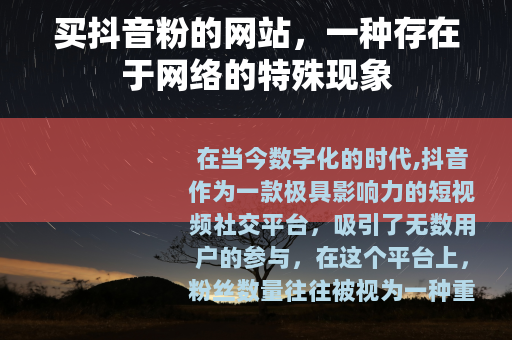 在当今数字化的时代,抖音作为一款极具影响力的短视频社交平台,吸引了无数用户的参与,在这个平台上,粉丝数量往往被视为一种重要的资产,它不仅代表着用户的受欢迎程度,还可能与商业机会、影响力等密切相关,一些人开始寻找买抖音粉的网站,希望通过这种方式快速提升自己在抖音上的粉丝量。