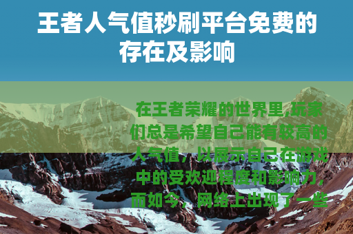 王者人气值秒刷平台免费的出现是游戏发展过程中的一个现象,它既给玩家带来了一些便利和机会,也带来了一定的挑战和问题,玩家在面对这些平台时,需要谨慎权衡利弊,在追求高人气值的同时,也要注重自身账号的安全和游戏的公平性,而游戏开发者则需要不断努力,营造一个更加健康、公平、有序的游戏环境,让玩家能够在其中真正享受到游戏的乐趣和价值。