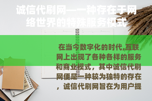 在当今数字化的时代,互联网上出现了各种各样的服务和商业模式,其中诚信代刷网便是一种较为独特的存在,诚信代刷网旨在为用户提供一系列的代刷服务,涵盖了社交媒体的点赞、评论、粉丝增长,以及各类平台的流量提升等多个方面。