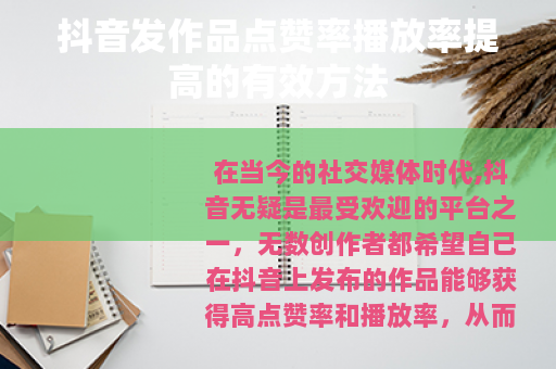 在当今的社交媒体时代,抖音无疑是最受欢迎的平台之一,无数创作者都希望自己在抖音上发布的作品能够获得高点赞率和播放率,从而吸引更多的关注和粉丝,究竟该如何提高抖音作品的点赞率和播放率呢?以下是一些实用的方法。 是关键,要确保你的作品具有独特性和吸引力,可以从自身的兴趣、特长出发,挖掘一些新颖的主题和创意,如果你擅长烹饪,那么可以制作一系列独特的美食制作教程,展示一些不常见的食谱或独特的烹饪技巧,这样能够吸引到对美食感兴趣的用户,在内容创作中要注重故事性,一个好的故事能够引发观众的情感共鸣,让他们更愿意停留并观看你的作品。