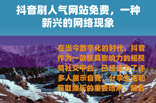 抖音刷人气网站免费是一种在抖音平台发展过程中出现的新兴网络现象,它既为用户提供了一种快速提升人气的可能途径,同时也带来了一系列的问题和挑战,我们需要在充分认识其利弊的基础上,采取有效的措施加以引导和规范,让抖音平台能够在一个健康、有序的环境中发展壮大,为用户提供更好的服务和体验。